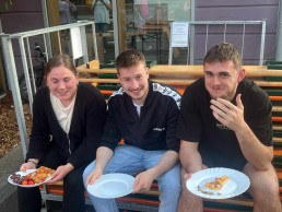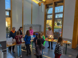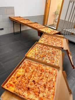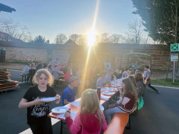 Nach einer Musical-Intensivprobe, die für alle sehr herausfordernd war, gab es ein leckeres Abendessen: Mit großzügigen Obstspenden der Eltern und sagenhaften sieben Riesenpizzen (ja, wir zählen sie als Kontinent!) stärkten sich die jungen Globetrotter und ihre acht Betreuer*innen für weitere bevorstehende Abenteuer.