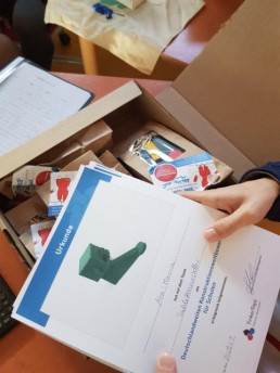 Zwei Wochen später erreichten uns zwei Pakete. Darin befanden sich unsere am 3D-Drucker ausgedruckten Konstruktionen, für jeden Teilnehmer eine persönliche Urkunde, ein herzliches Anschreiben und 5 Tüftlerboxen zum Thema „Licht“.