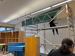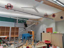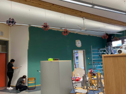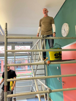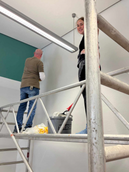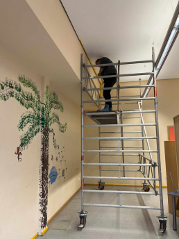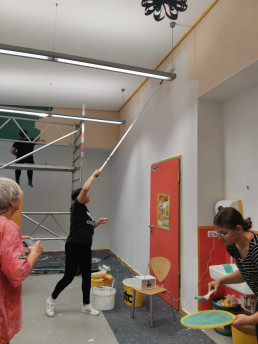 Die Mittagsbetreuung Wirbelwind sollte schöner werden! Die Mitarbeiter hatten genug von den faden Gelbtönen, die alles andere als wohnlich wirkten. Doch Fachleute waren teuer und hatten keine Zeit. Zum Glück sprang Marco Bütterichs Freund von der Firma Heinrich Schmid ein und spendete genug Farbe in Weiß und Petrol. Der Bauhof stellte uns ein Gerüst sowie Werkzeuge zur Verfügung, und die Herausforderung war klar: Unsere beiden 3-Meter-hohen Räume an einem Tag streichen! Eine fast unlösbare Aufgabe, aber wir waren fest entschlossen und voller Tatendrang: