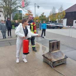 Am 24.10.2022 unternahm die 7. Klasse einen Ausflug zur Freiwilligen Feuerwehr Bad Rodach, um die Dinge, die sie im NuT-Unterricht über die Verbrennung gelernt hatten, einmal praktisch zu erproben. Um 10:00 starteten wir mit einer kurzen Theorieeinheit. Hier lernten wir von Sebastian Schnabel etwas über die Aufgaben und die Ausrüstung der Feuerwehr, über die verschiedenen Brandklassen und darüber, wie man sich im Brandfall verhalten sollte und in einer solchen Situation einen Notruf richtig absetzt.