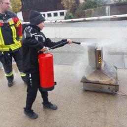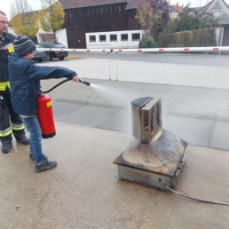 Im Anschluss daran erwartete uns eine praktische Einheit auf dem Hof der Feuerwehr. Hier galt es zunächst, einen simulierten Brand mit einem Wasserfeuerlöscher zu löschen.