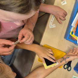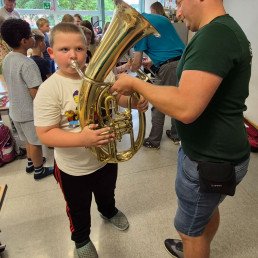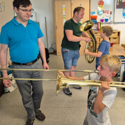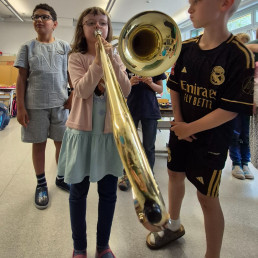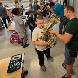 Mit viel Begeisterung und Neugier durften die Schülerinnen und Schüler selbst Hand anlegen und die Instrumente ausprobieren. Ob Trompete, Klarinette oder Tuba – für jedes Kind war etwas dabei. Besonders beliebt war auch die kreative Aktion, bei der sich die Kinder ein Tattoo mit ihrem Lieblingsinstrument machen lassen konnten.