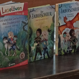 Mit den Lehrerinnen machten sie sich auf den Weg zum Haus des Gastes. Im Festsaal erwartete Fr. Madouche ihre Gäste. Sie las und erzählte aus der Reihe „Der Zauberschüler“. Alle Zuhörer waren gebannt von den großen Abenteuern Flos, dem Zauberschüler des fiesen Hexenmeisters Basil Humbuck.