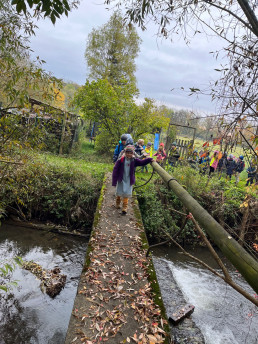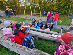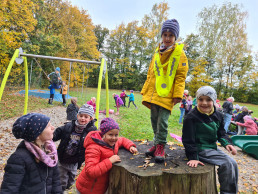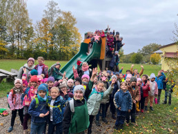 Wir marschierten durch eine herrlich herbstliche Landschaft, mitten durch raschelnde Blätterberge, „vorbei“ an verlockenden Matschpfützen, und erreichten nach knapp einer Stunde unser Ziel. Dort galt es eine sehr schmale Brücke zu passieren. Ob die wohl hält? Im Gänsemarsch balancierten wir vorsichtig, aber gekonnt drüber und durften uns dann auf eine längere Rast auf dem Spielplatz der alten Schule in Roßfeld freuen. Eine einäugige, sehr zutrauliche Katze tauchte aus dem Dickicht auf und weckte sofort das Interesse der Kinder. Was ihr wohl passiert ist?
