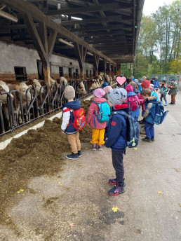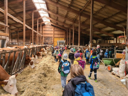 Nach ausgiebiger Tobepause mit Fußballspielen, Klettern und Rutschen ging es auf den Rückweg. Wir machten noch einen Abstecher in einen Kuhstall, in dem uns gefühlt 100 Kühe neugierig beäugten. Die Milchtiere waren wahrscheinlich genauso überrascht über die Invasion wie wir über ihre Anzahl. Die Kinder hatten großen Spaß daran, die Kühe zu füttern, während der Besitzer des Stalles, Herr Rottmann, geduldig alle neugierigen Fragen beantwortete.