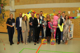 An der Grundschule in Bad Rodach wurden 70 Erstklasskinder von der Schulleiterin Rektorin Manuela Oppel herzlich willkommen geheißen und mit einer kleinen Geschichte über „Jeder ist ein bisschen anders – Du gehörst zu uns!“ auf die nun beginnende Schulzeit eingestimmt. Die Musical- und Trommelkinder der Schule umrahmten die Feierstunde in der sehr ansprechend geschmückten und voll besetzten Turnhalle der Schule. Landrat Sebastian Straubel dankte in seinen Grußworten der Sparkasse Coburg-Lichtenfels für die Emil-Trinkflaschen, die seit 26 Jahren die Glasflaschen für die Erstklasskinder in Stadt und Landkreis Coburg spendieren und somit einen wichtigen Beitrag für den Umweltschutz leisten. Die Sicherheit im Straßenverkehr ist gerade in der bevorstehenden dunklen Jahreszeit sehr wichtig. Hier sind die von der Kreisverkehrswacht Coburg e.V. sowie der AOK Coburg finanzierten Sicherheitswesten, die ebenfalls alle Schulanfänger in Stadt und Landkreis erhalten, ein wertvoller Schutz. Die Polizei unterstützt die Hinweise über Sicherheit im Straßenverkehr mit einem Malbuch für jedes Kind. Schulamtsdirektorin Gisela Rohde wandte sich direkt an die ABC-Schützen, indem sie fragte, wer sich denn auf den heutigen Tag gefreut hat. Bürgermeister Tobias Ehrlicher überreichte von der Stadt Bad Rodach kleine, mit Süßigkeiten gefüllte Waffeltütchen, die VR Bank hatte für jedes Kind ein kleines Handtuch als Geschenk mitgebracht. Elternbeirat und Förderverein der Schule brachten einen Obstsaft aus der Region sowie eine Garderobentasche mit. Nachdem die Schulanfänger von ihren Schulpaten ihre Zuckertüte überreicht bekamen, ließ am Ende der Feierstunde Herr Pfarrer Rosenzweig zusammen mit den Kindern 70 Luftballons mit guten Wünschen für die Schulzeit in den Himmel steigen. Symbolisch durften Bastian und Thea alle Geschenke in Empfang nehmen.