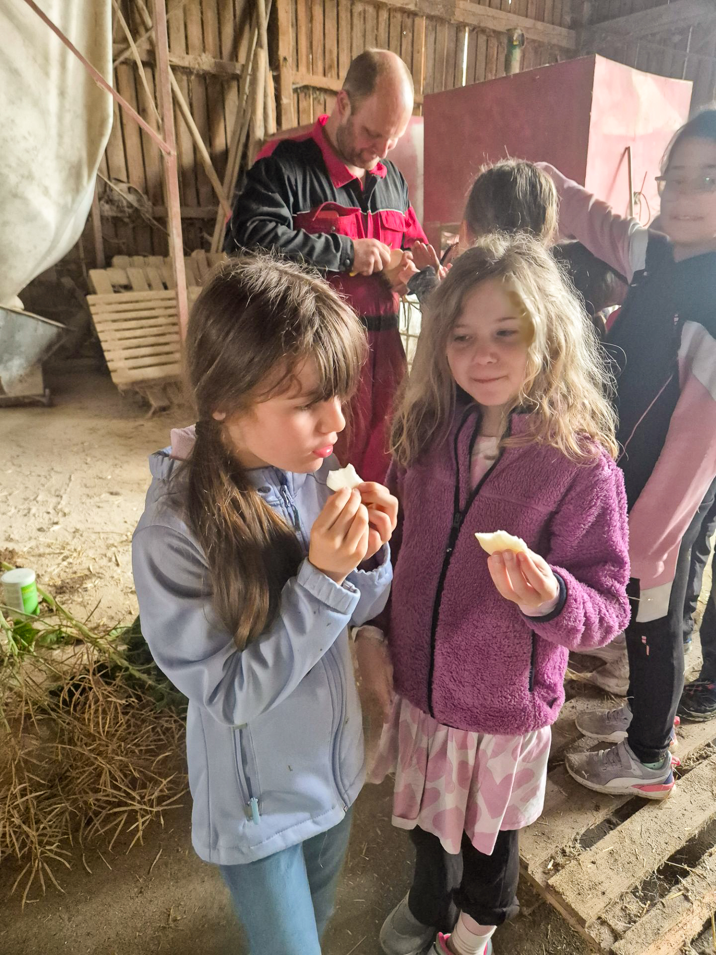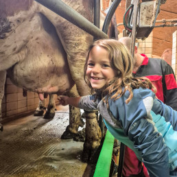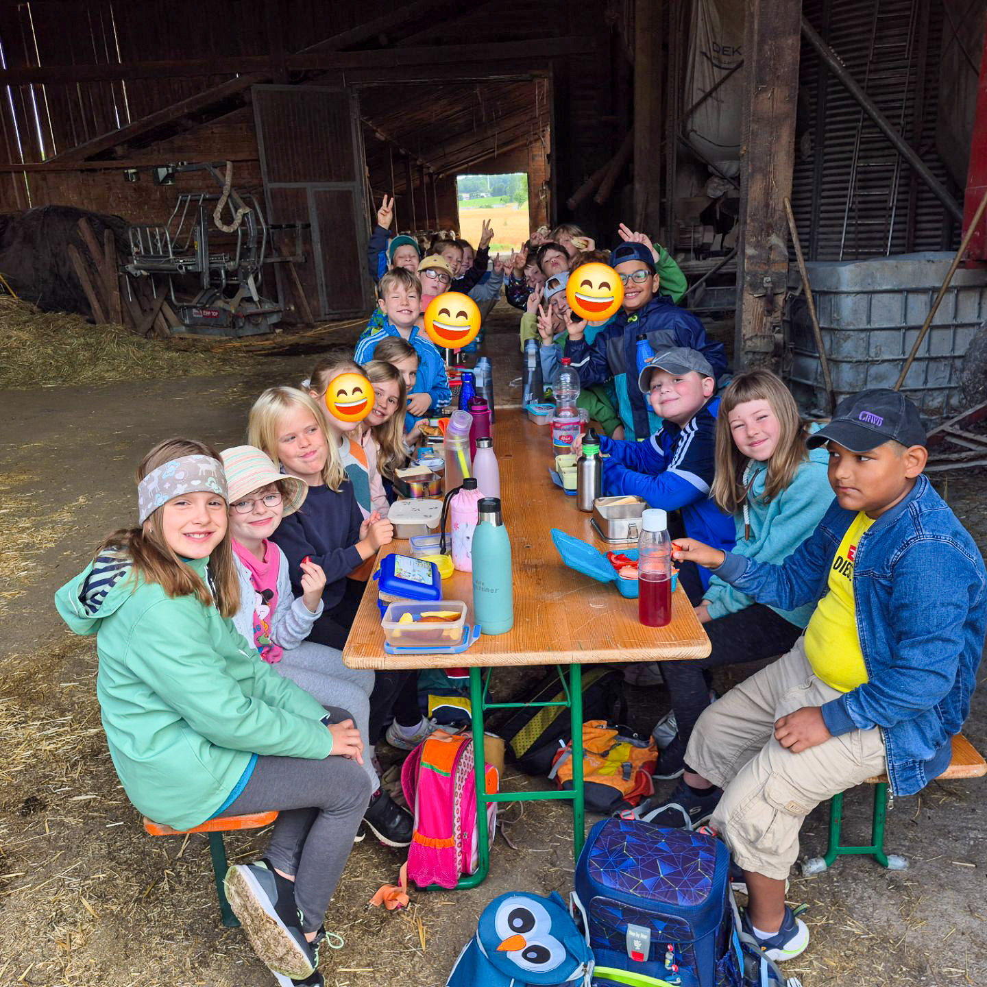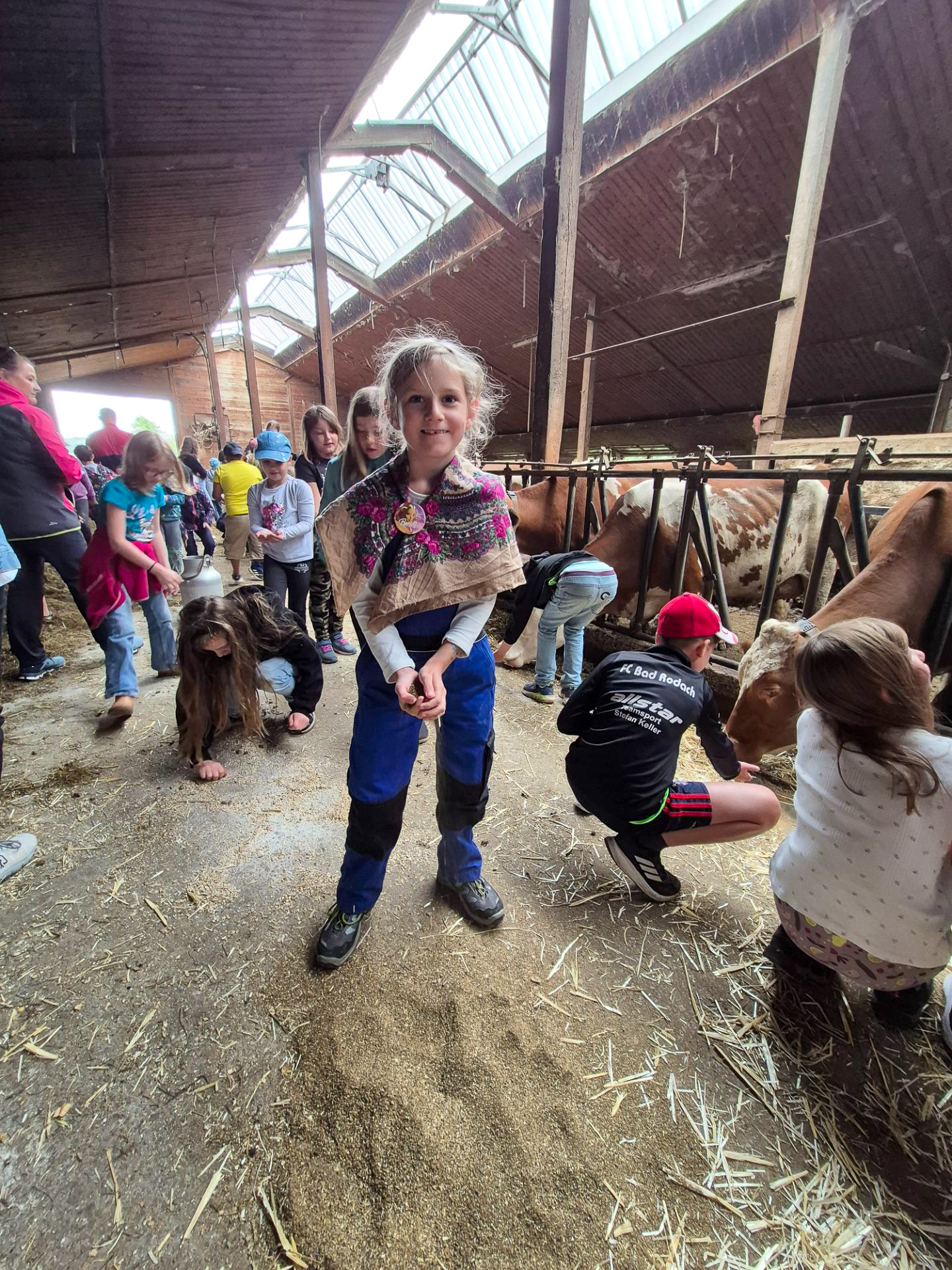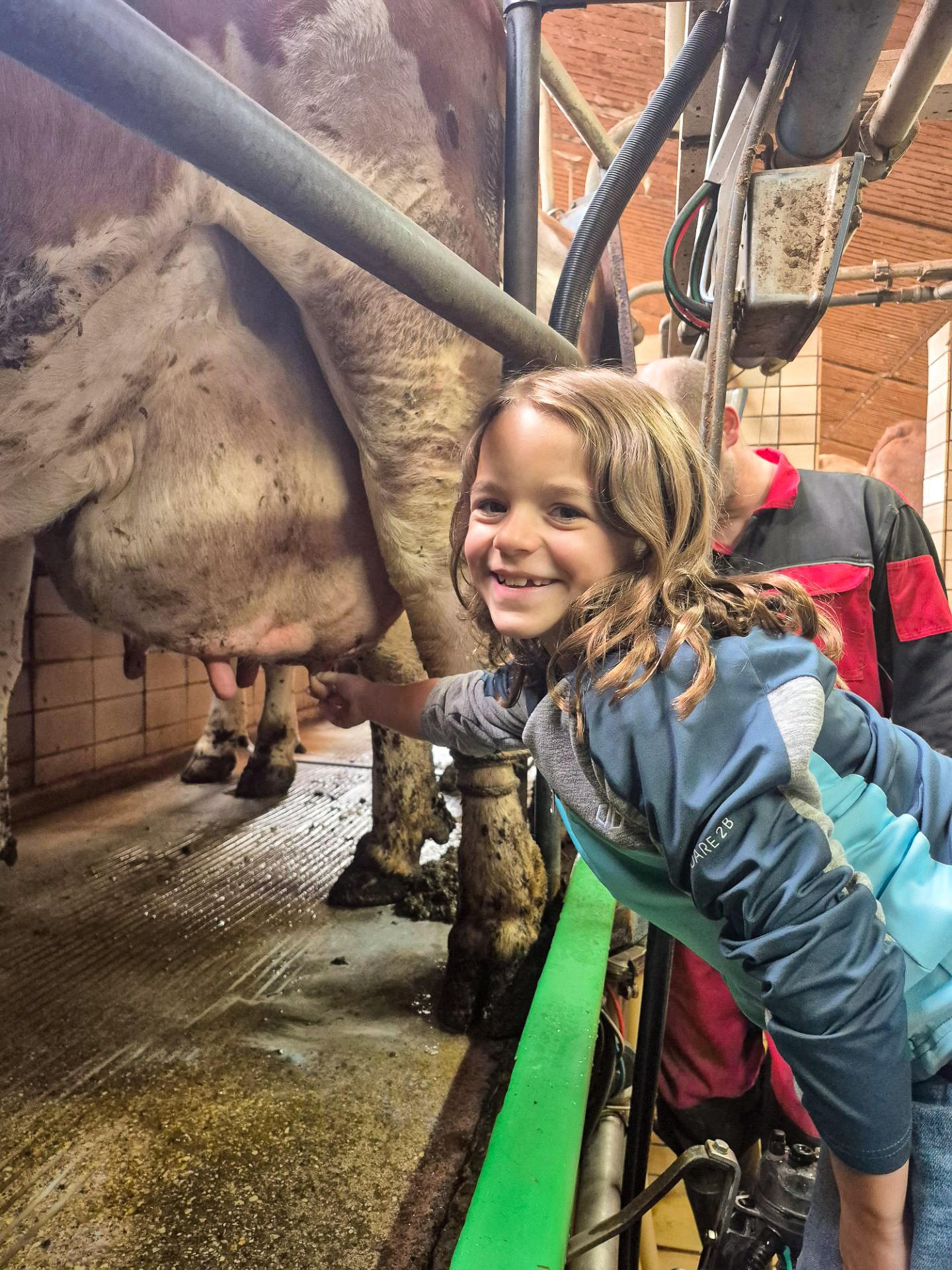 Zum krönenden Abschluss der Projektwoche besuchten die Klassen einen Bauernhof. Im Melkstand durften die Kinder selbst Hand anlegen, sie fütterten Kühe und kümmerten sich begeistert um die Kälbchen. So wurde Milchviehhaltung greifbar und erlebbar.