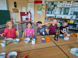 „Was steckt eigentlich in einem Pfannkuchen?“ – mit dieser Frage startete die Projektwoche. Auf einem Lernpfad mit Stationen zu Milch, Eiern und Mehl tauchten die Kinder in Herkunft und Verarbeitung ein. Sie rührten, probierten und erfuhren spielerisch, dass hinter alltäglichen Zutaten spannende Geschichten stecken.