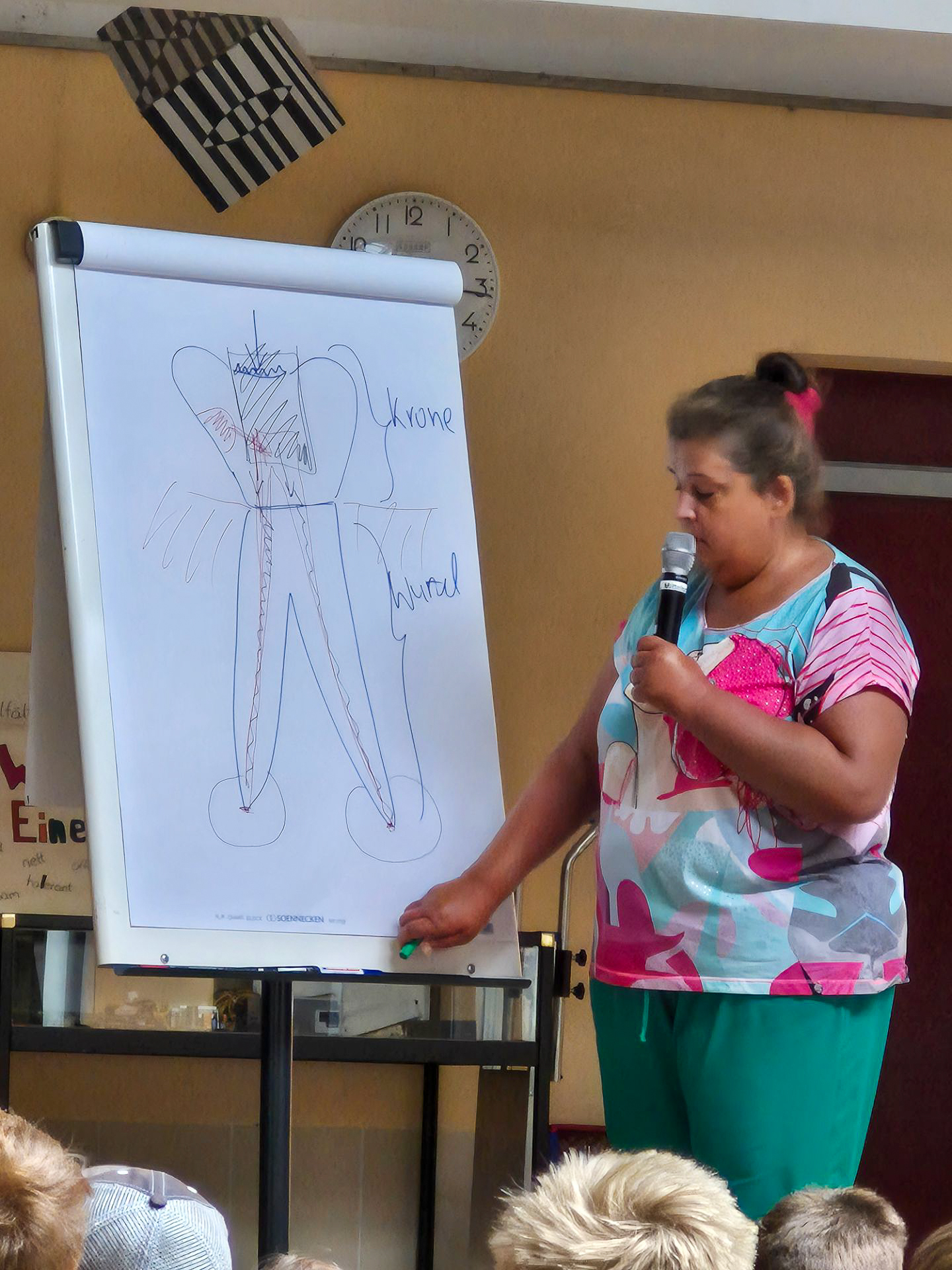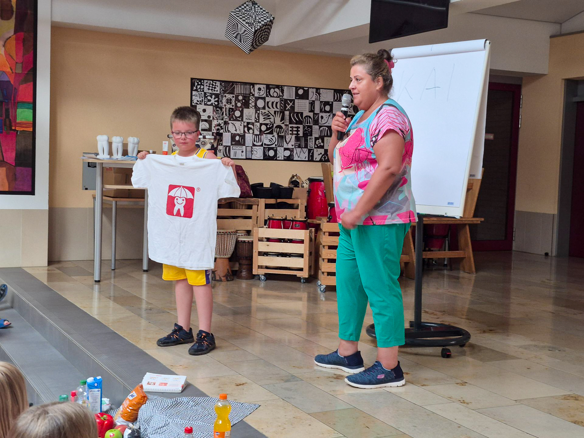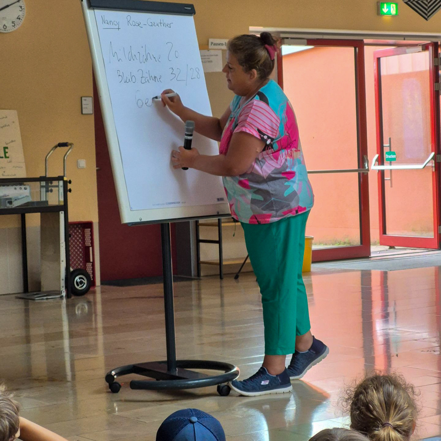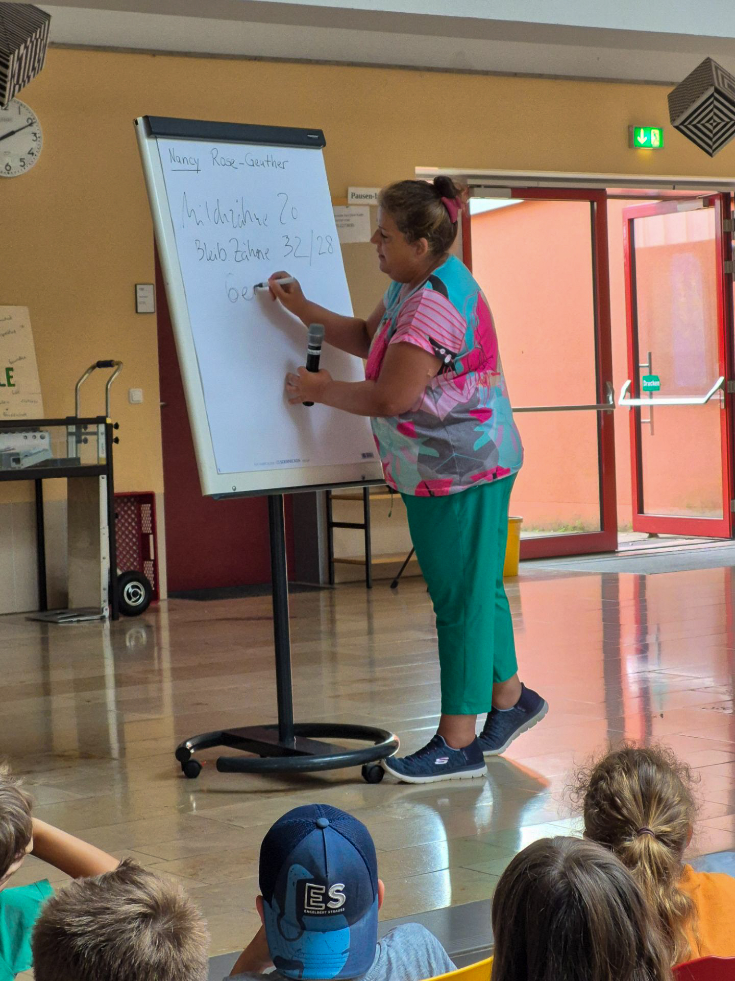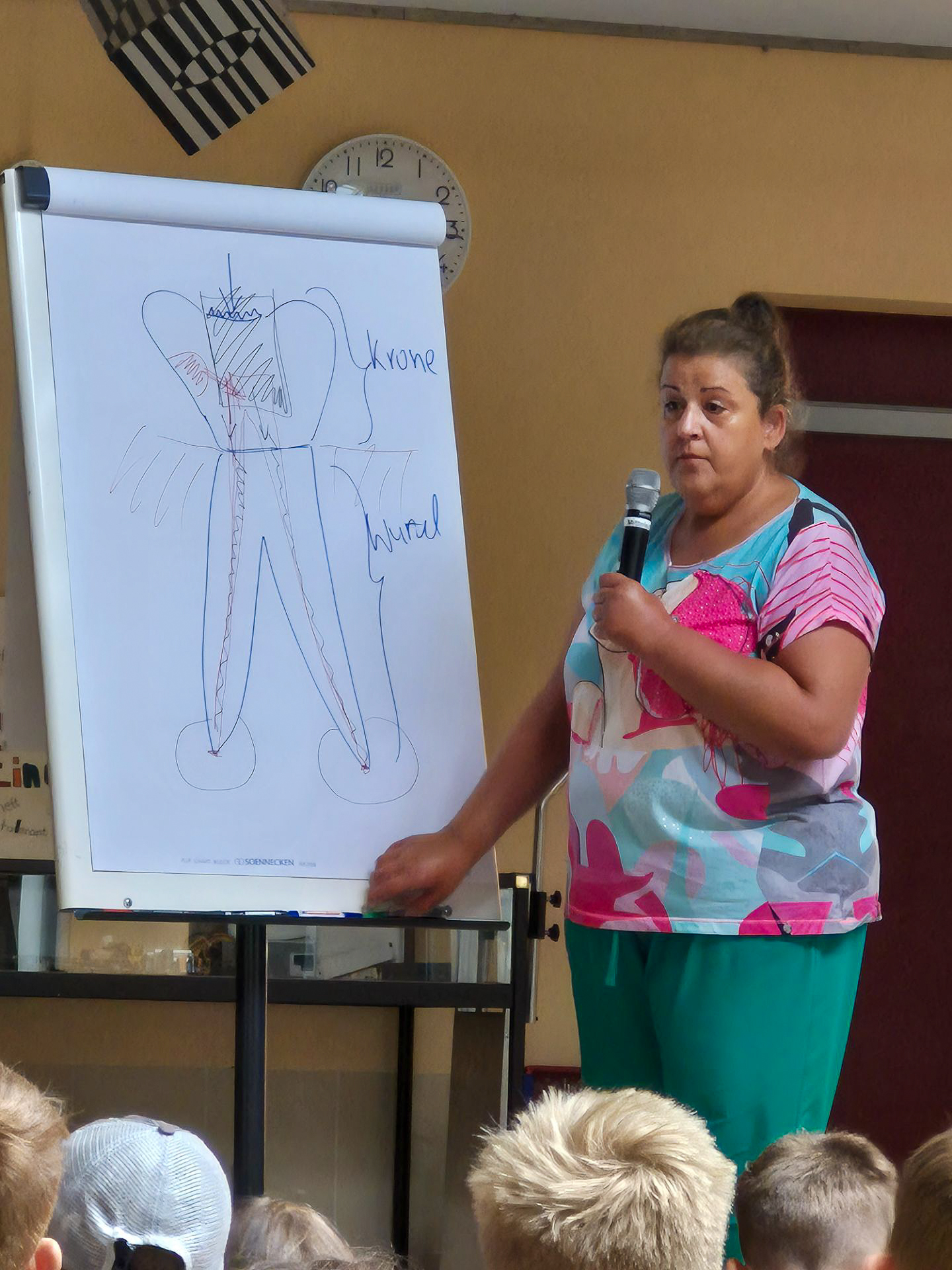 Ein besonderes Highlight war der Besuch von Zahnärztin Frau Rose-Geuther. Mit anschaulichen Beispielen zeigte sie, wie wichtig gründliches Zähneputzen ist. Für Staunen sorgte der Blick auf den versteckten Zucker in vielen Lebensmitteln – ein echtes Aha-Erlebnis.