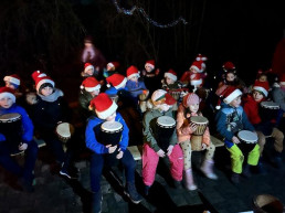 Die Trommelzwerge bei ihren ersten großen Auftritten beim Adventsfenster im Waldbad sowie...