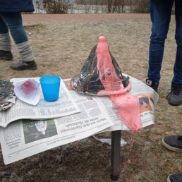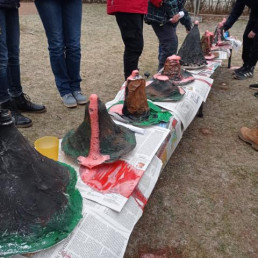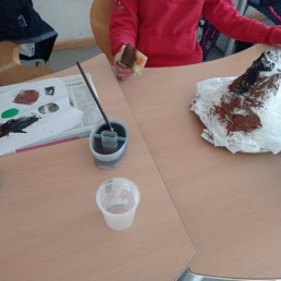 In der Woche vor den Weihnachtsferien setzte sich die 6. Klasse intensiv mit dem Thema „Vulkane“ auseinander. So wurde zunächst besprochen, wie es zur Entstehung eines Vulkans kommt. Danach durften die Schülerinnen und Schüler selbst aktiv werden und ihren eigenen Vulkan aus Tapetenkleister und Zeitung gestalten. Um die Vulkane möglichst naturgetreu aussehen zu lassen, wurden diese mit Acrylfarbe bemalt. Höhepunkt des Projekts war der „Ausbruch“ der Vulkane mit Hilfe einer Mischung aus Sprudelwasser, Backpulver, Essig und roter Lebensmittelfarbe.