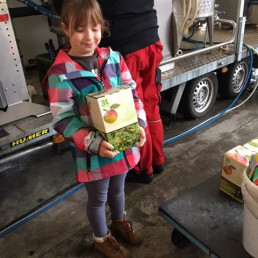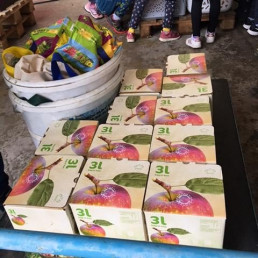Wir sahen zu, wie aus ihnen Saft gepresst, dieser heiß in Plastiktüten mit Auslass-Ventil abgefüllt und dann in bunte Pappkartons verpackt wurde. Mit großem Genuss verkosteten wir gemeinsam den köstlichen Saft.